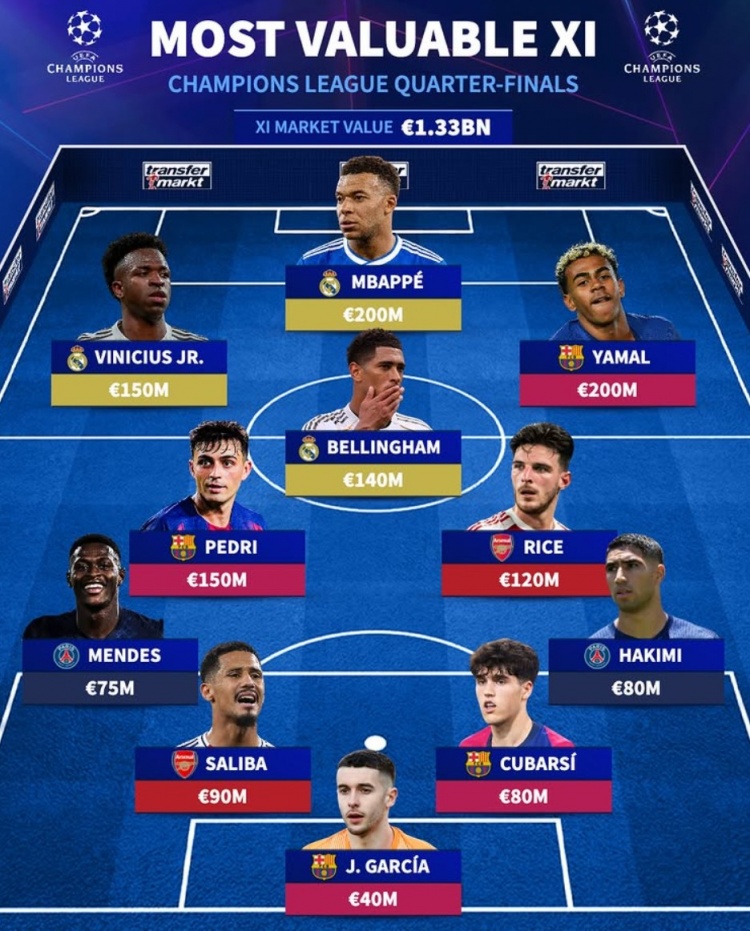 PP电子「中国」官方网站-德转列欧冠八强战最贵阵:姆巴佩、亚马尔领衔,皇马3将、巴萨4人